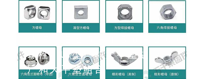 螺栓類:外六角螺栓、外六角法蘭面螺栓、內六角圓柱頭螺栓、吊環螺栓、膨脹螺栓、沉頭內六角螺栓、盤頭內六角螺絲、馬車螺栓、雙頭螺栓、蝶型螺絲、活節螺栓、地腳螺 栓、U型螺栓、四角螺栓等 螺帽類:鉚螺母、吊環螺母、
