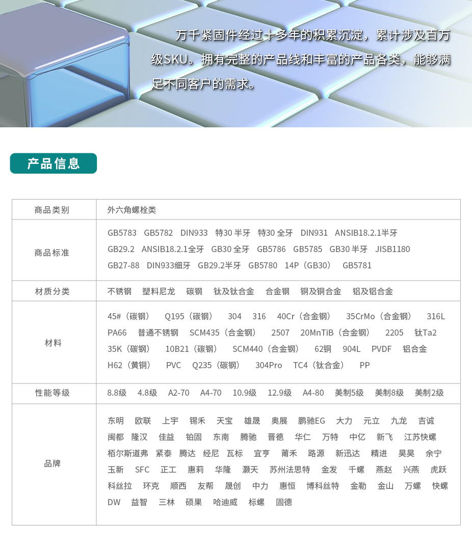 六角螺栓:由頭部和螺桿(帶有外螺紋的圓柱體)兩部分組成的一類緊固件,需與螺母配合,用于緊固連接兩個帶有通孔的零件。